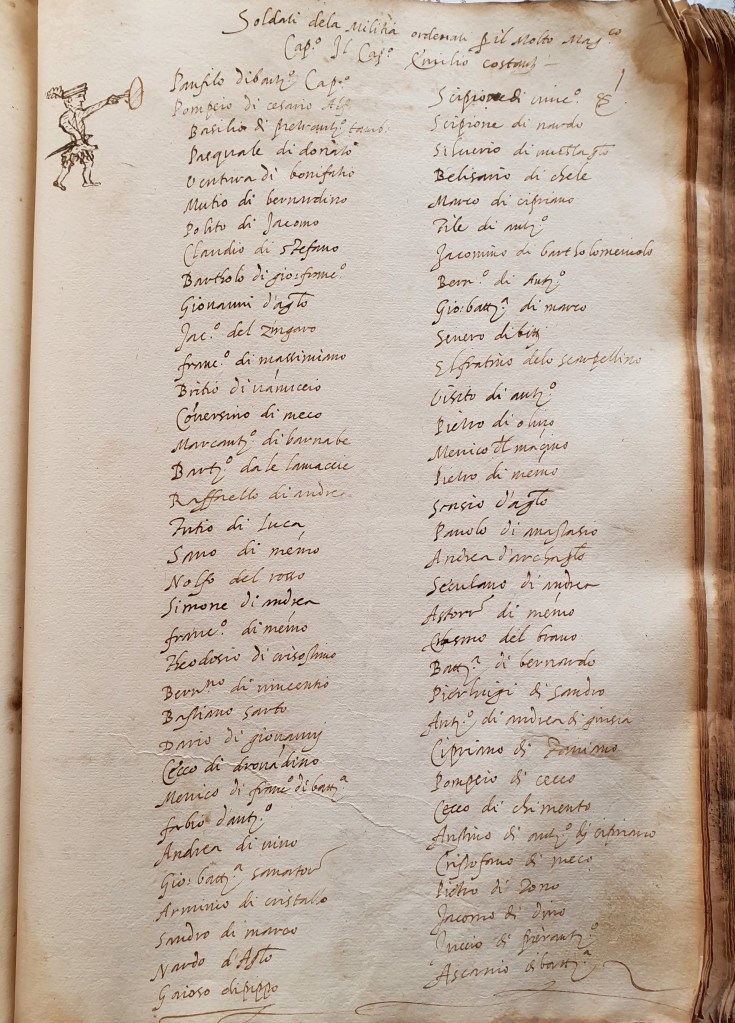 Ma la sua carriera inizia sicuramente con la carica di Capitano della milizia sancascianese composta da 66 uomini e dall’alfiere Pompeo di Cesario, agli ordini prima del senese Emilio Costanti e poi di Scipione Vieri. Non sappiano in quali fronti abbiano combattuto, le sei croci accanto ai nomi dei soldati nel ruolo agli ordini del Vieri ci fanno temere che ci possano essere state delle perdite nel contingente sancascianese.