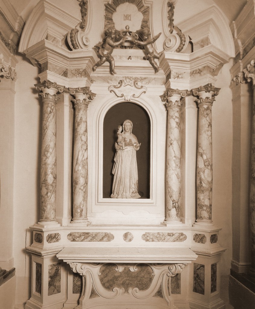 Finalmente in una macchia di spini e sterpi trovò la causa di questo strano atteggiamento dei suoi buoi: nascosta fra i cespugli c’era una statua della Madonna con in braccio Gesù Bambino.